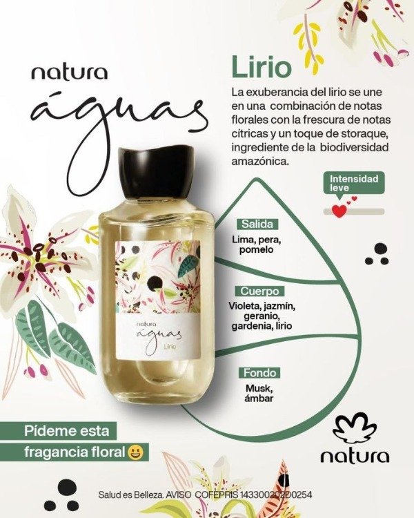 La exhuberancia del lirio se une a una combinación de notas florales con la frescura de notas cítricas y un toque de Estoraque, ingrediente de la biodiversidad Amazónica.